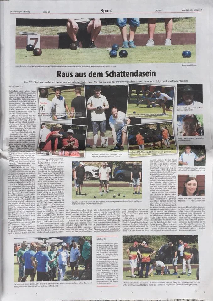 Pátek třináctého mnoho lidí považuje za nešťastný den, kdy mnozí podléhající obavám z tohoto dne, ani nevylezou z postele. To však neplatilo v pátek třináctého července 2018 pro šestici českých bowlerů (členů oddílu cílových sportů TJ Sokol Liboc), kteří v tento den poprvé v historii českého bowlsu vyjeli do zahraničí na mezinárodní turnaj – do východoněmeckého městečka Löbichau. V pátek odpoledne si tedy nejlepší čeští hráči lawnbowlsu poprvé vyzkoušeli i lawnbowlsové dráhy jinde než doma v areálu Sokola Liboc. V sobotu se pak čestí bowleři rozdělili do dvou tříčlenných týmů a soutěžní premiéra mohla začít. Turnaje se zúčastnilo patnáct týmů z Německa, Belgie, Nizozemí – a dva z Čech. První tým pod názvem Tschechien 1 v sestavě Jan Létal, Karel Šturm a skip Theodor Jan Létal si ve své skupině vedl nad očekávání dobře – po úvodní remíze všechny tři následující zápasy jednoznačně vyhrál (i nad výběrem Belgie) a suverénně postoupil do play- off. Druhý tým hrající pod názvem Tschechien 2 v sestavě Libor Svatoň, Jindřich Svatoň a skip Slávka Vařečková měl start do turnaje mnohem těžší – první dvě utkání prohrál, ovšem poté se mu po zlepšených výkonech podařilo dvakrát vyhrát a taktéž postoupit mezi nejlepších osm týmů do play-off. Čtvrtfinále se pak lépe vydařilo týmu Tschechien 1, který po přesvědčivém výkonu nedal soupeři šanci a s přehledem postoupil už do semifinále. České dvojce se dařilo o něco méně, o jednu kouli prohrál – ovšem jak se později ukázalo, byla to prohra s týmem, který celý turnaj vyhrál. V semifinále pak naše 1 nestačila na domácí favority. Celkové čtvrté a šesté místo českých týmů při zahraniční premiéře je však skvělým výsledkem. Gratulujeme!